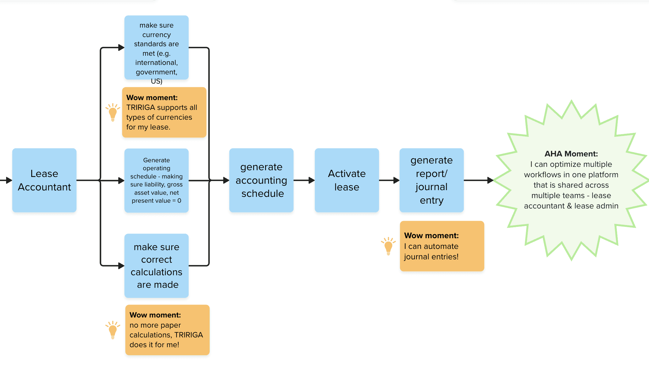 Map out lease workflow to highlight individual capabilities of each persona that leads to Aha moments